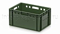 Ящик используется как контейнер универсальный и активно применяется в качестве пищевого контейнера и контейнера для продуктов, включая ящик для мяса серии Е и ящик для колбасных изделий. Евроформат позволяет использовать изделие как евроконтейнер, совместимый с другими ящиками серии и стандартным оборудованием.